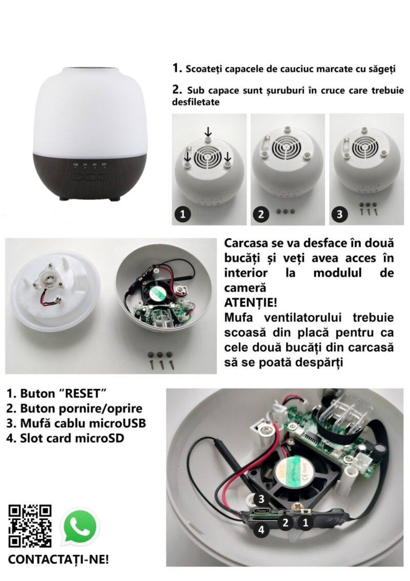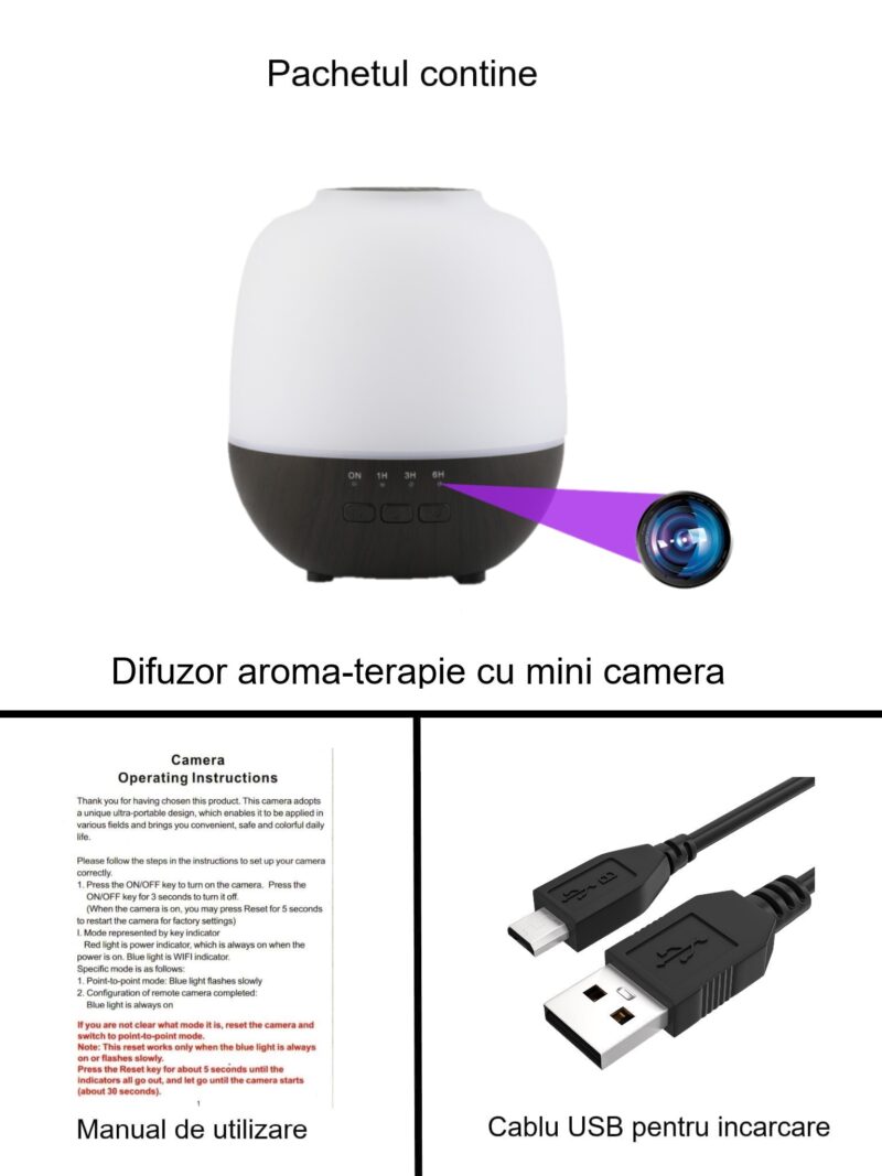 Instructiunile sunt pentru introducerea cardului SD sau pentru resetare. Camera este trimisa pornita nu trebuie decat sa conectati difuzorul de aroma terapie la o sursa de alimentare.