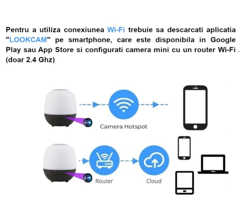 Camera cu tehnologie Wi-Fi IP P2P vă permite să vizualizați ce se filmează direct de pe telefon, tabletă sau computer. Dacă vă aflați la o distanță de 5-10 de metri de micro cameră . Dacă în respectiva locație există internet wireless, puteți conecta minicamera direct la router și va rezulta o cameră video IP wireless ce vă permite monitorizarea de oriunde din lume.