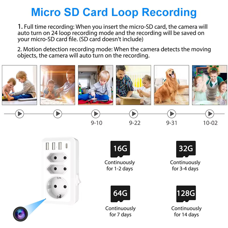 Memoria internă suportată de mini cameră este de un card micro-SD de până la 128 Gb (nu este inclus) . Cu funcția de înregistrare în buclă, camera spion va înlocui cel mai vechi fișier si va continua înregistrarea și salvarea fișierelor noi.