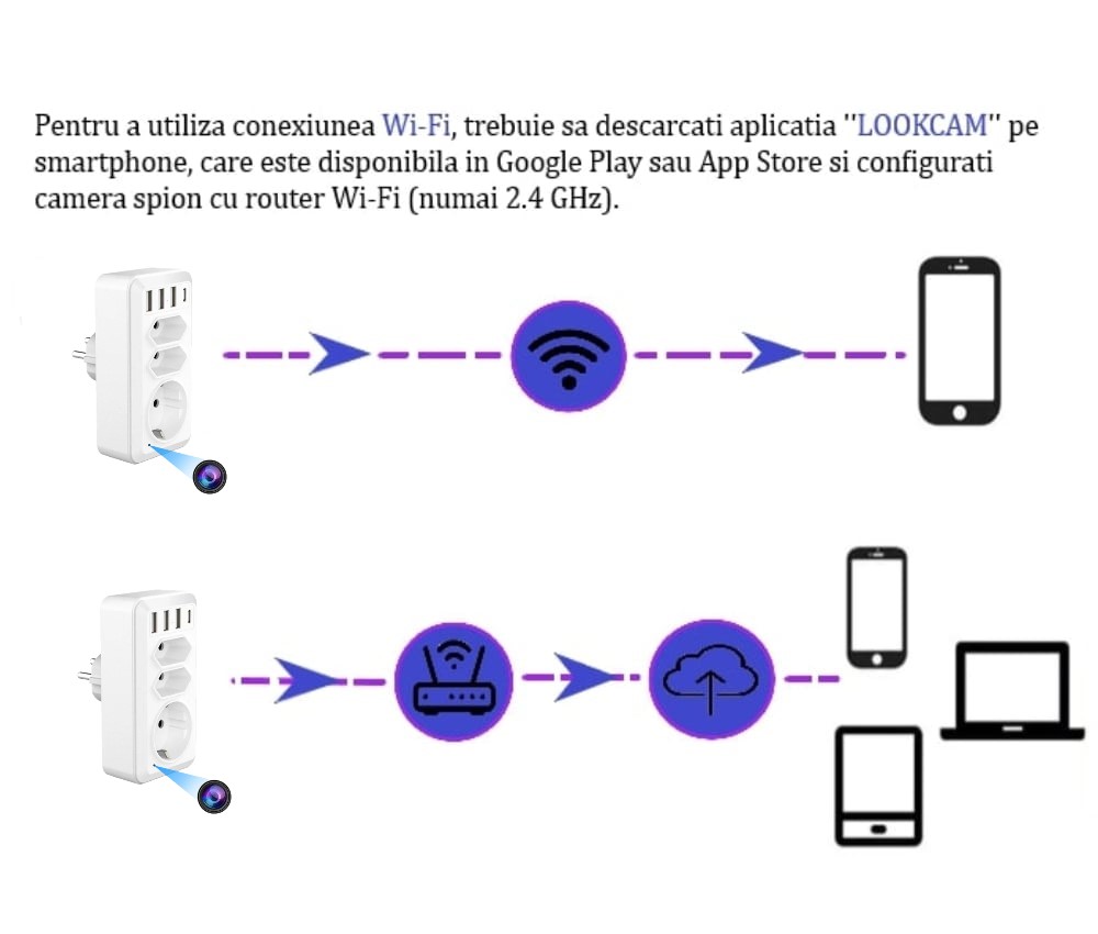 Camera spion cu tehnologie Wi-Fi IP P2P vă permite să vizualizați ce se filmează direct de pe telefon, tabletă sau computer, dacă vă aflați la o distanță de 5-10 de metri de microcameră sau dacă, în respectiva locație există internet wireless, puteți conecta minicamera direct la router și va rezulta o cameră video IP wireless mascată ce vă permite monitorizarea de oriunde din lume .