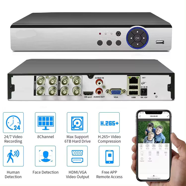 TSS-AHD08N este un XVR cu 8 canale video si suporta tehnologiile HDCVI, HDTVI, AHD, CVBS, IP, ce poate inregistra imagini provenite de la camere de supraveghere ce au o rezolutie maxima de 5 Megapixeli, cu maxim 10  cadre/secunda/canal.